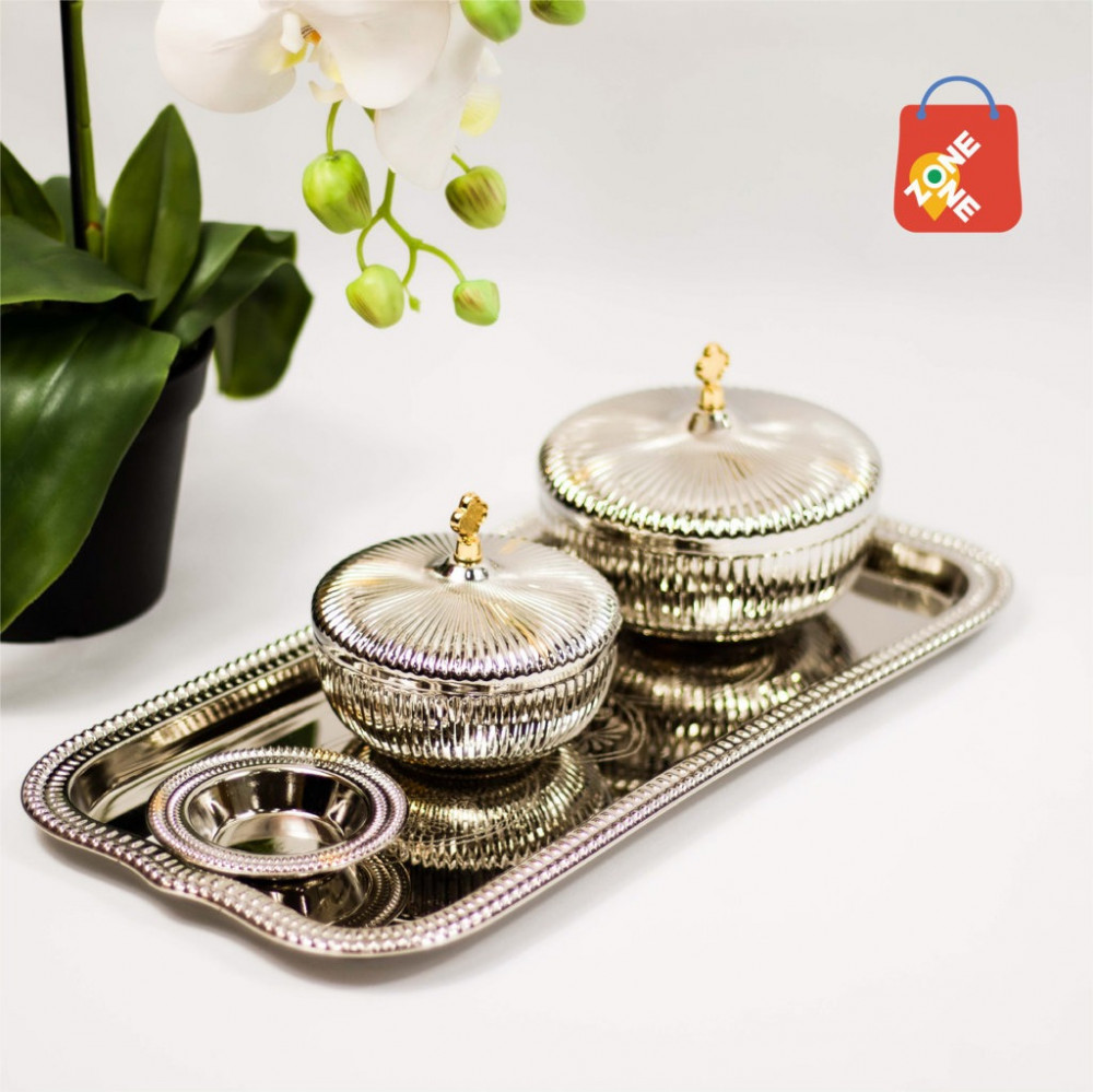 الجمال و الرقي بطقم متكامل ، مثالي للاستعمال اليومي و الضيافة أيضاً، مكون من صينية و تمرية و صحن خاص بالنواة.