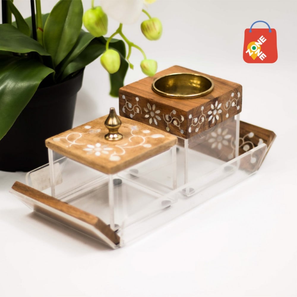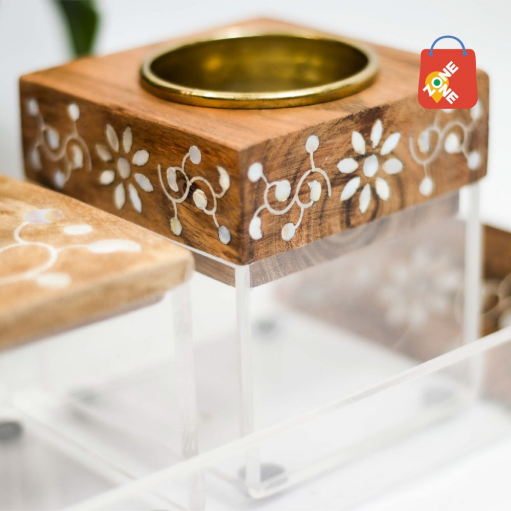أضف لمسة من الأناقة العصرية من مباخر أكريلك شفاف مع طقم مبخرة أكريلك شفاف وخشب، مكون من ثلاث قطع فاخرة تجمع بين الجمال والعملية. يشمل الطقم طقم مبخرة مع صندوق وطقم مبخرة مع صينية مصنوعة من الخشب المنحوت بتفاصيل رائعة وقطع من الصدف، مما يضفي لمسة فنية راقية على ديكور منزلك.