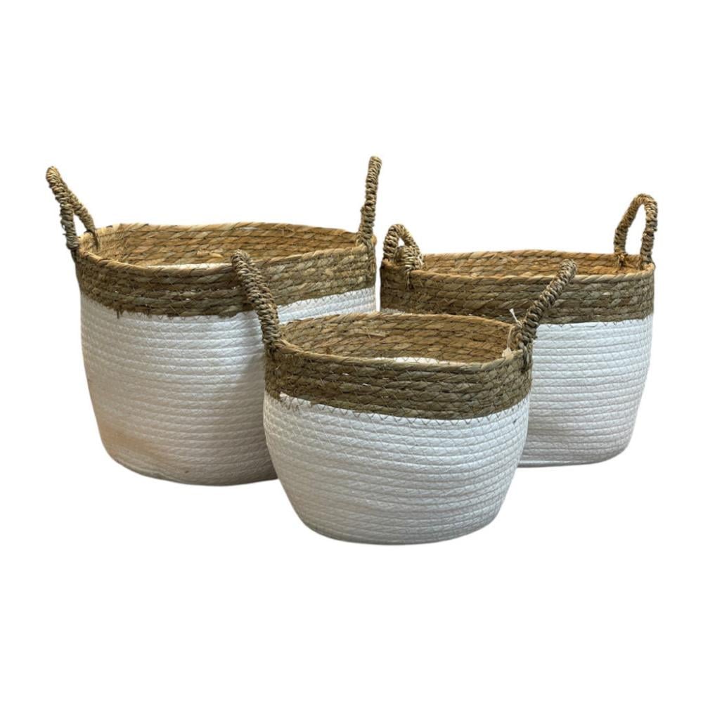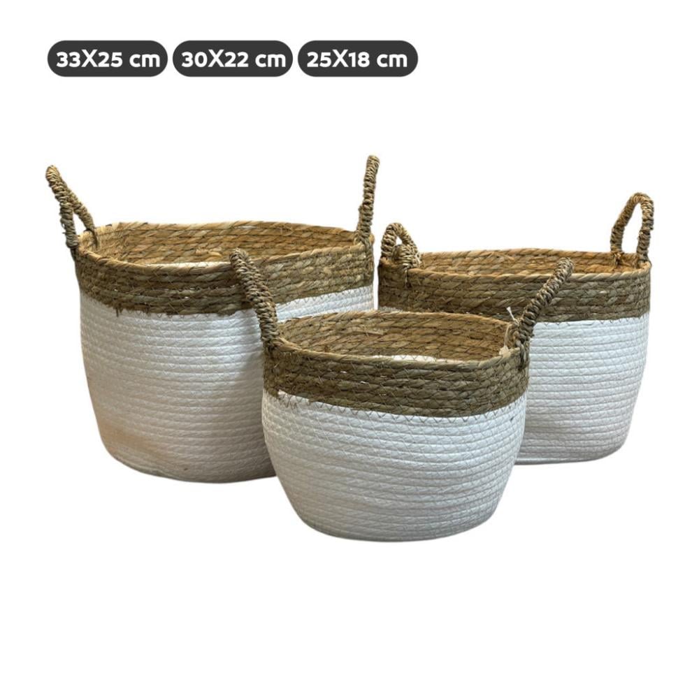 بلون بيج المصممة خصيصًا لترتيب الأغراض بكفاءة وجمال. تأتي السلات بثلاثة مقاسات متدرجة مما يوفر لك خيارات متعددة لتلبية احتياجاتك المختلفة. مصنوعة من الخوص الطبيعي عالي الجودة