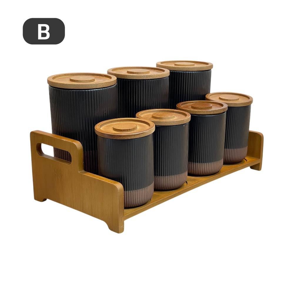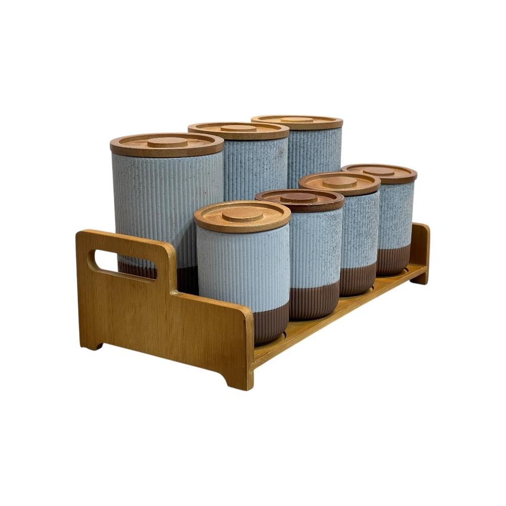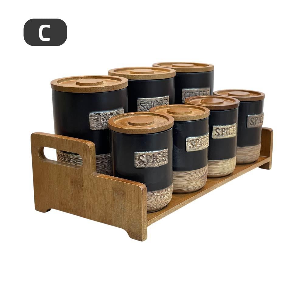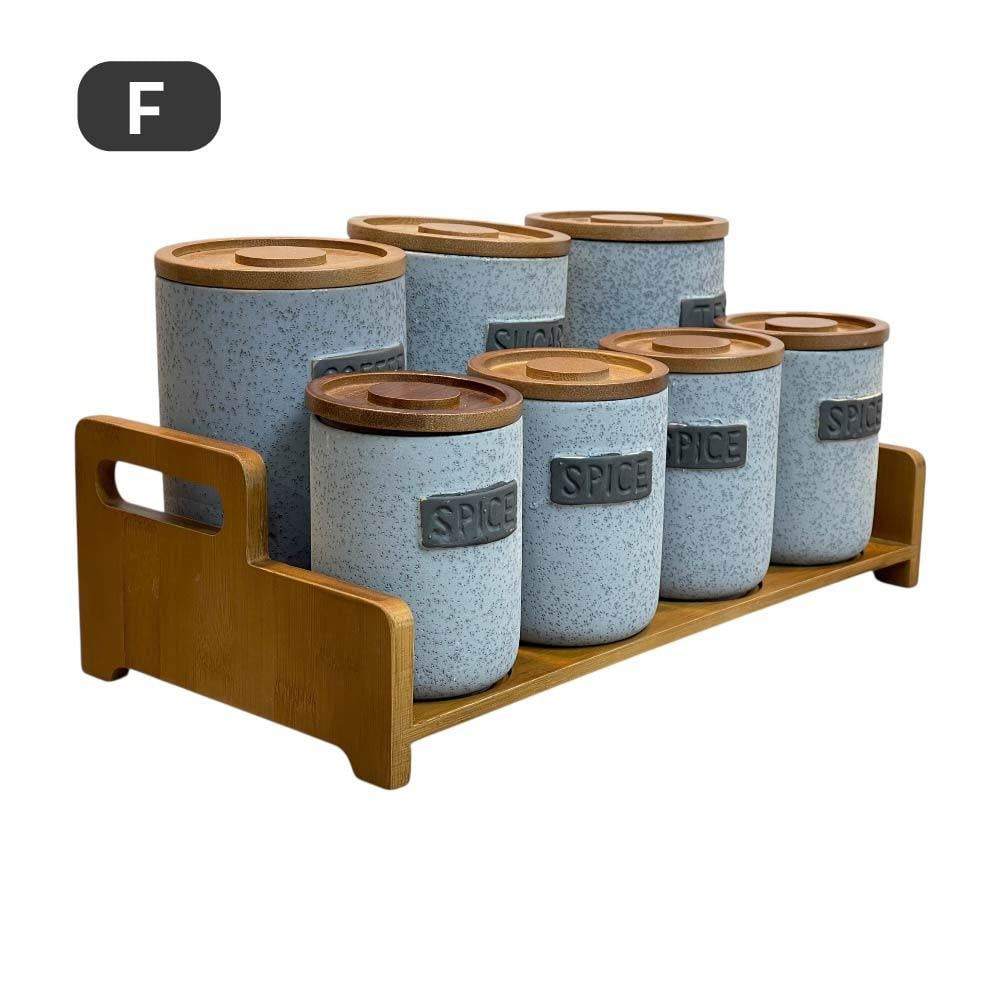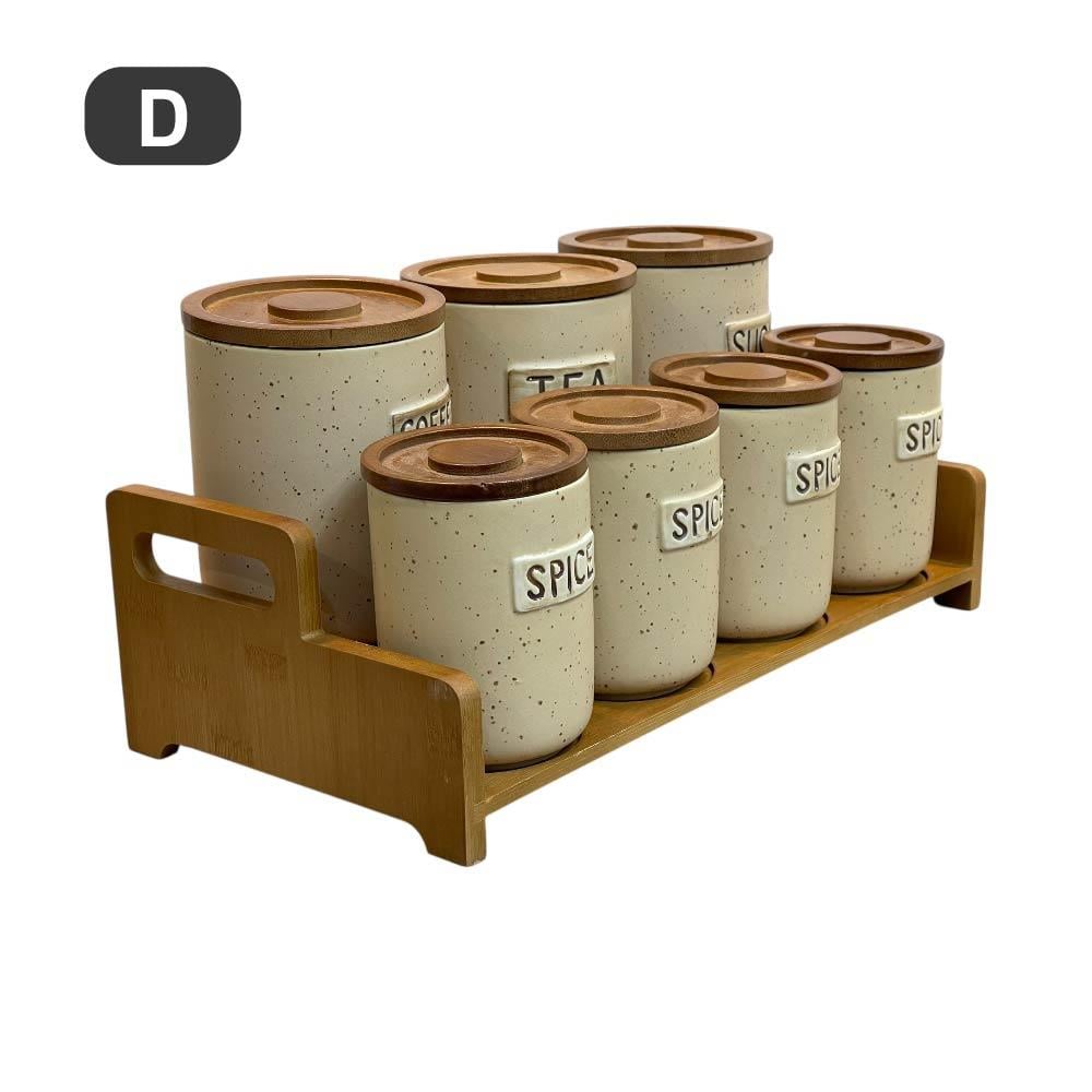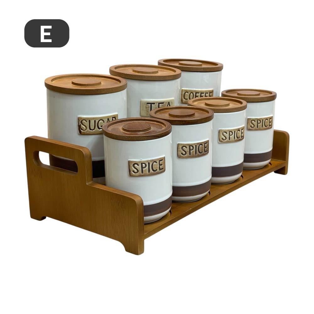 احصل على طقم علب بهارات سيراميك ستاند خشب لتجربة طهي منظمة وأناقة متجددة في مطبخك. تصميم يجمع بين العملية والجمال الطبيعي ليبقى رفيقك اليومي.