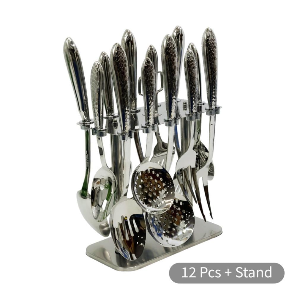 إليك طقم ملاعق تقديم من الستانلس ستيل المكون من 12 قطعة مع ستاند ستانلس ستيل، الاختيار الأمثل لإضافة لمسة من الفخامة إلى مائدتك في أي مناسبة.